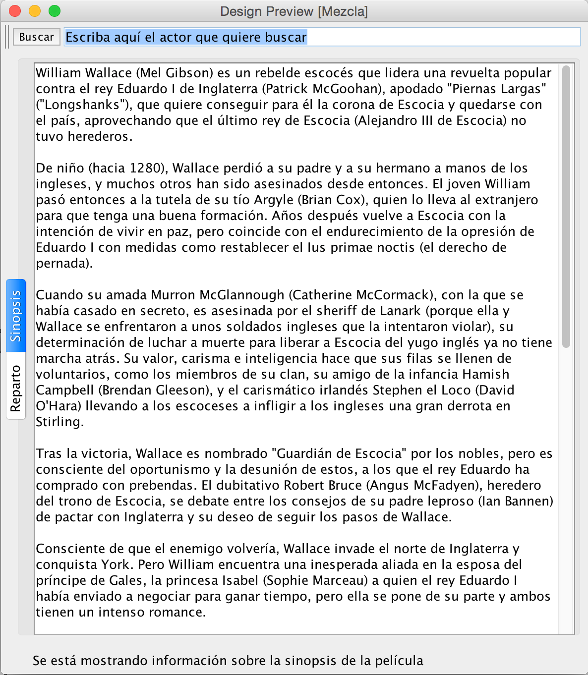 • Sinopsis: tendrá un texto (JTextPane) con la sinopsis de la película. Debe poderse hacer scroll para que se visualice el texto completo en caso de que sea demasiado largo.