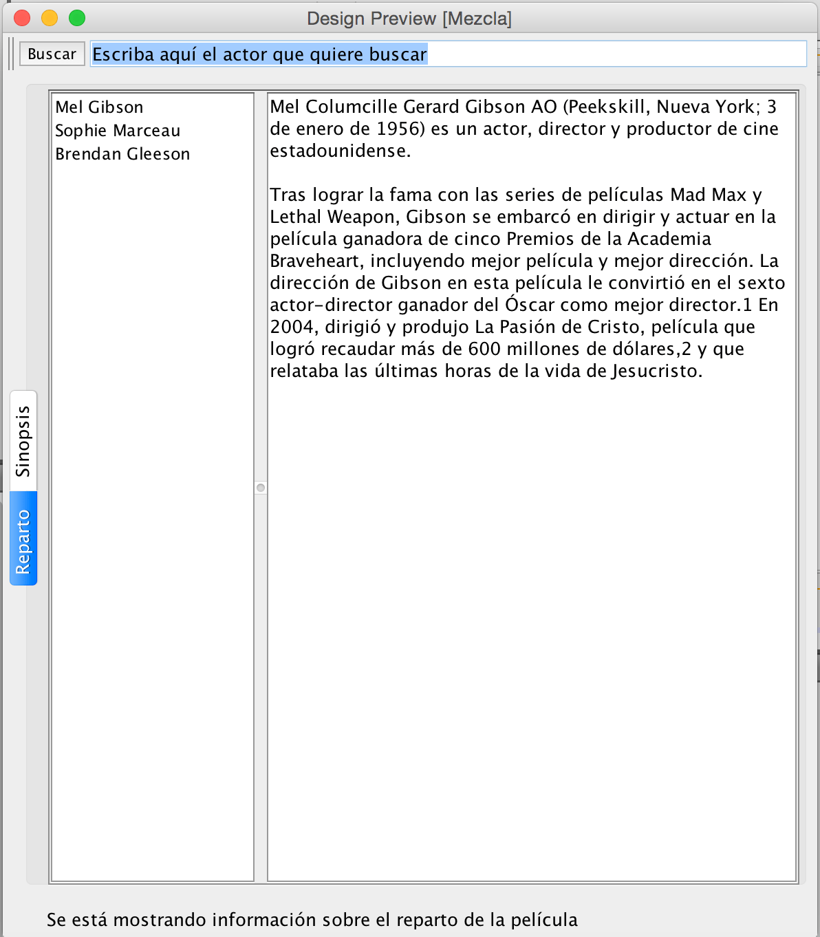 • Reparto: dispondrá de dos partes: a la izquierda se mostrará una lista (JList) con tres actores. En función del que se seleccione se mostrará su información de la derecha (JTextPane).