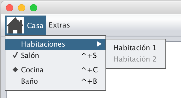 Crea una aplicación llamada «casa» que disponga de un menú con la siguiente distribución:
